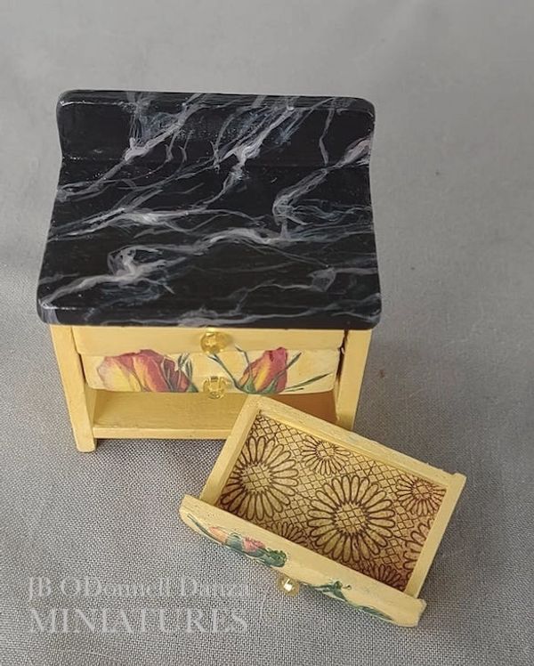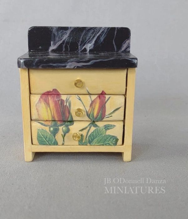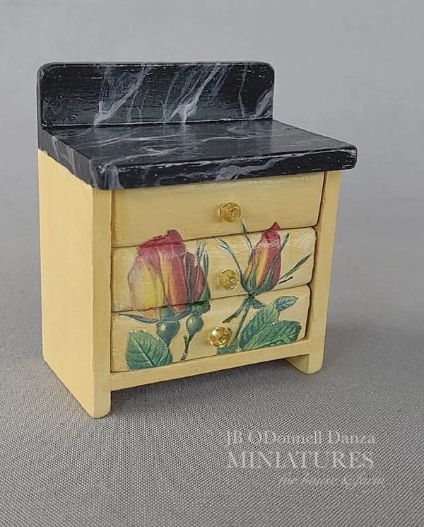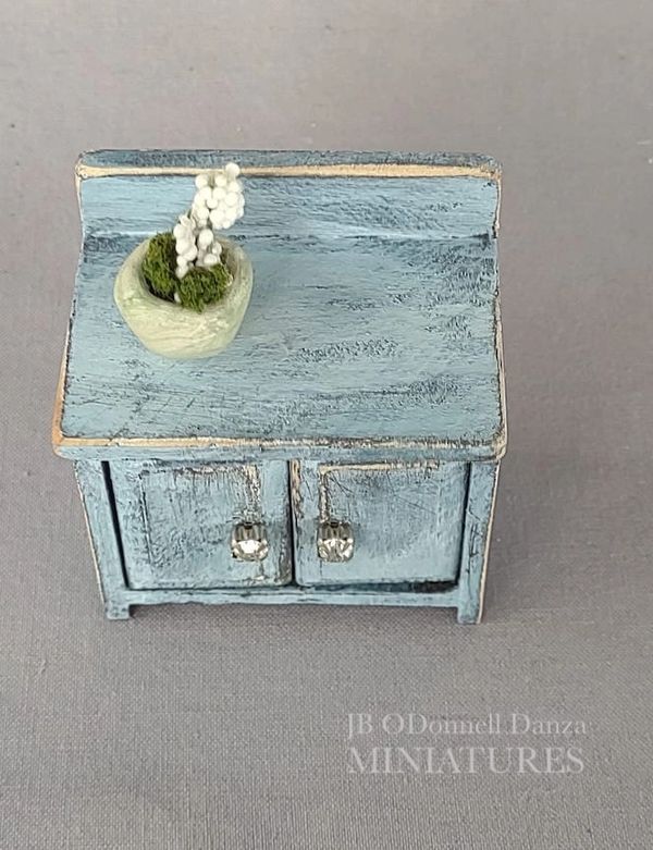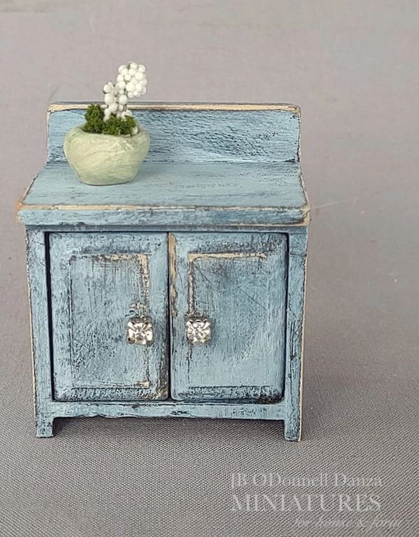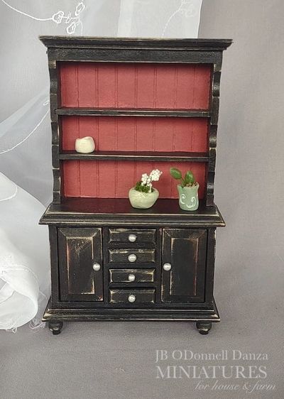 Description: Hand painted and distressed 1:12 scale hutch with doors and drawers. Painted black and a slight metallic cranberry this hutch has been distressed on corners and in just the right areas. Pulls have been painted silver. Inside has been painted cranberry. Decorative pots are not included in sale. Shown for decoration purposes only.